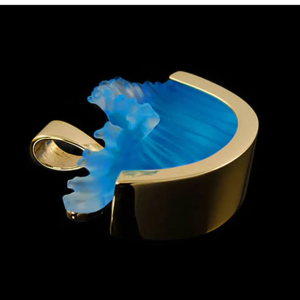 Matt Bezak Makes This Beautiful Wave Pendant Entirely By Hand. This Wave Pendant Is Made Of 14K Yellow Gold And Glass And Features One Pearl Set At The Base Of The Waves Curl. The Blue Wave Portion Is Made Of Hand-Casted Glass.